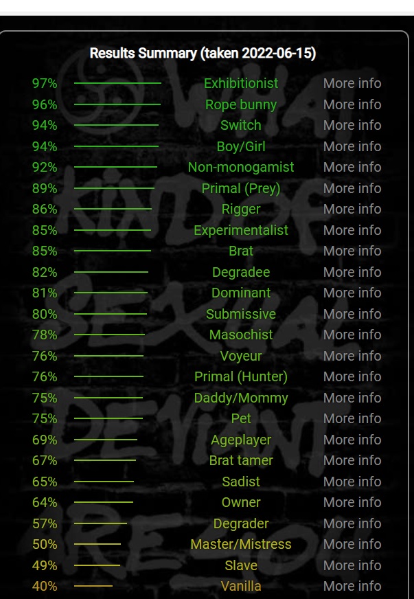 Non-Monogamous was still high in 2022, but probably not as high as in previous years. I would expect that to be the same or maybe slightly lower for this test because I’ve been working through the idea that I might be Demisexual (that’s another looonnggg blog post for another time). Dominant came in ever so slightly higher than Submissive last year. Honestly, I think this time it will be the other way around and maybe by a larger margin. I’ve definitely been in a more vulnerable headspace and that tends to bring out my submissive side strongly. Especially when I call my playmate (M) Daddy in bed, and he is very much the dominant. Most of my Domme work tends to be professional and online exclusive these days, and I’m ok with that just now.